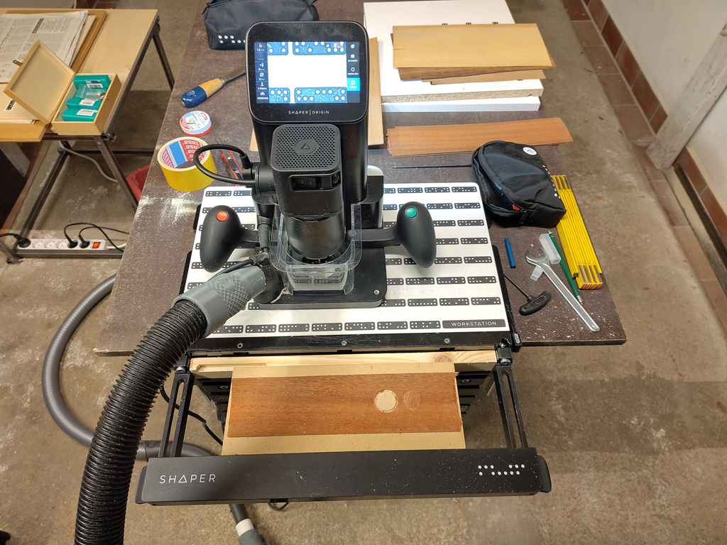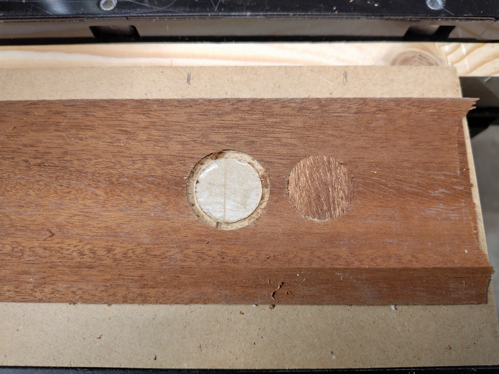Der ausgefräste Furnierkreis blieb kleben. Das zweite gefräste Loch passt im Durchmesser exakt, auch ohne Fräs-Versatz. Wir sind begeistert!