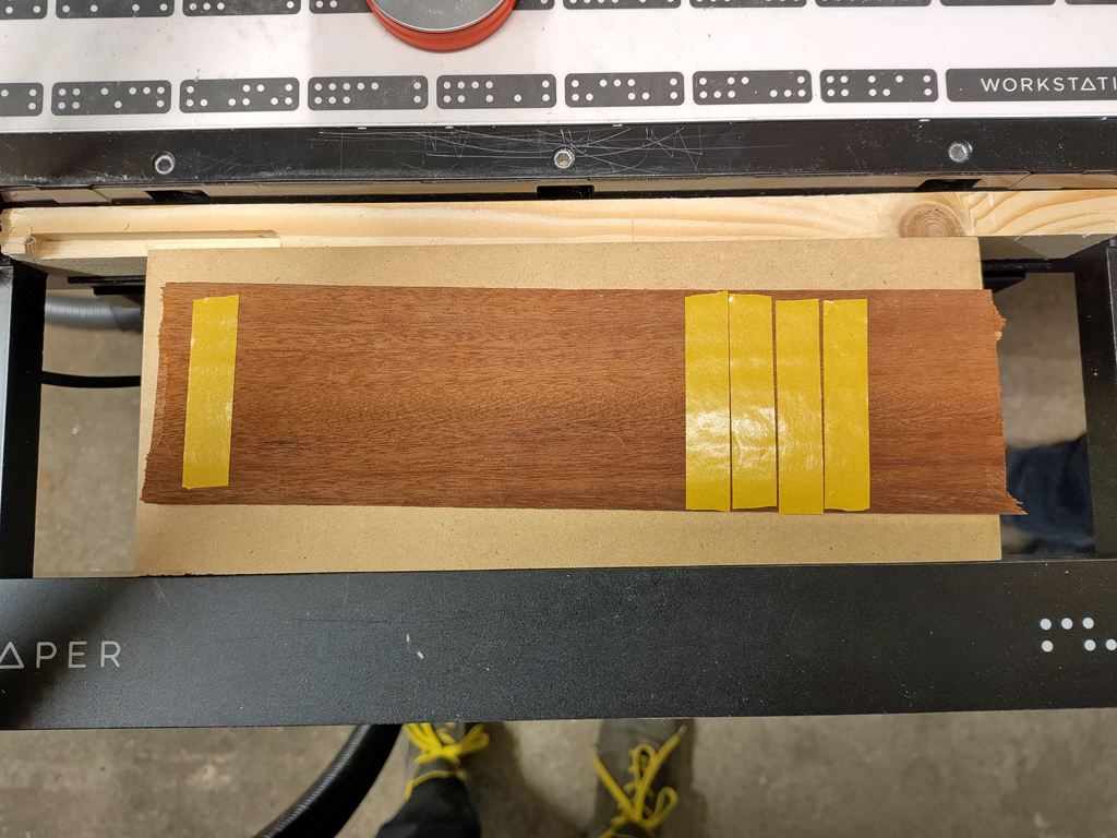 Und so rätseln wir zusammen: Mit welchem Furnier starten wir? Kann das mit dünnem Furnier funktionieren, oder wird der Fräser das Furnier zerfetzen? Kann das mit unserem 3mm Fräser funktionieren? Einen dünneren Fräser haben wir nicht. Wie kleben wir das Furnier fest? Ist schwach klebendes Doppelklebeband geeignet?