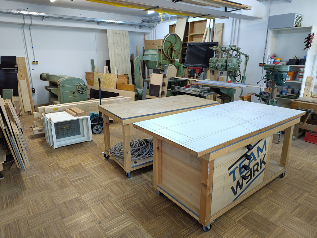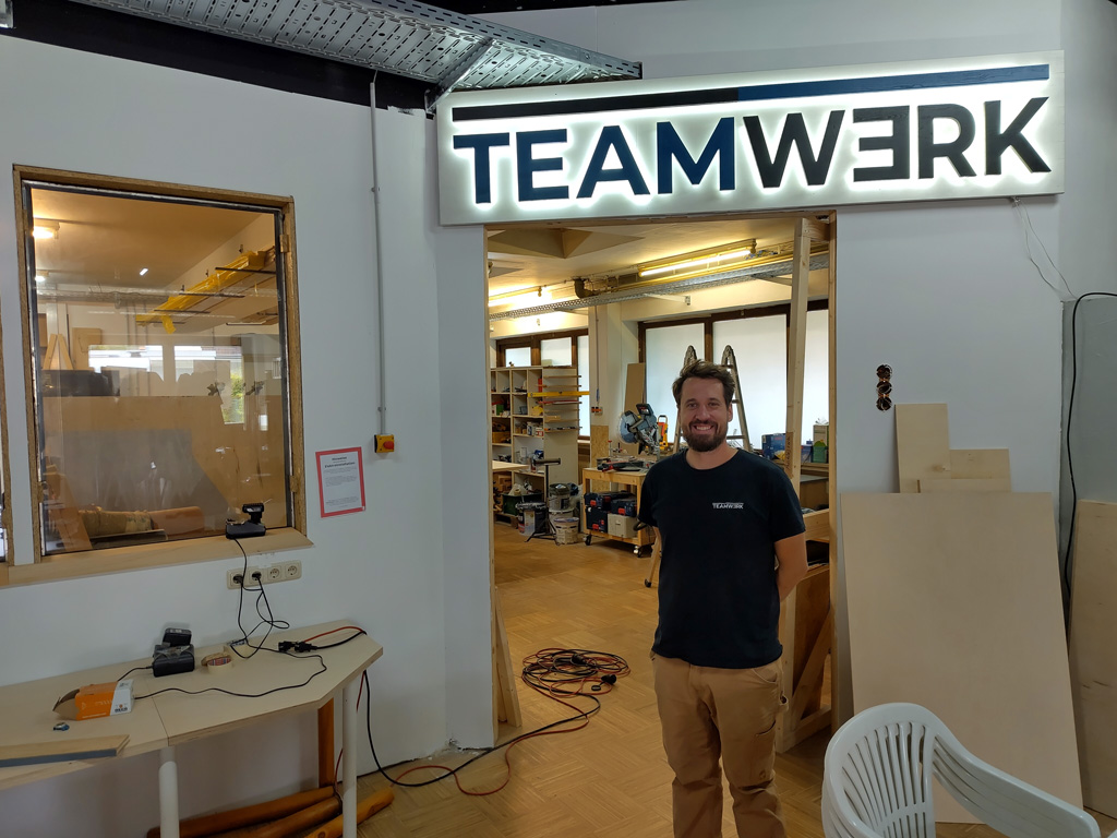 Ich werde am Eingang von Basti begrüßt, der gerade auf eine Holzlieferung wartet. Basti führt mich durch die Räume und gibt mir einen Überblick was das Teamwerk so zu bieten hat.