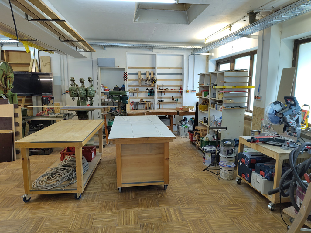 Im Vorraum wird gerade noch an der Einrichtung und an den Lagerboxen gearbeitet. Hier sollen die Besucher in gemütlicher Atmosphäre einen ersten Einblick in die Werkstatt bekommen. Große Tische bieten reichlich Platz zum Tüfteln. Durch eine Fensterfront bekommt man schon erste Einblicke in die Werkstatt im hinteren Bereich. Eine Schiebetür trennt den Vorraum von der Werkstatt.