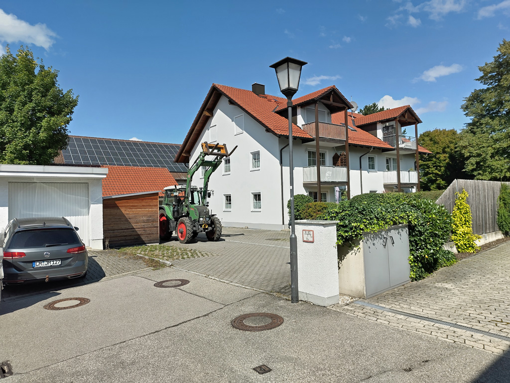 Der kurze Fußmarsch zur Teamwerk Werkstatt führt vorbei an weiteren großzügig dimensionierten Wohnhäusern. Irgendwann wähnt man sich in einem Wohnviertel und fragt sich, wo man denn hier eine Werkstatt unterbringen soll. In der Zufahrt zum Teamwerk weitere Wohnhäuser mit ländlichem Flair und Fuhrpark.